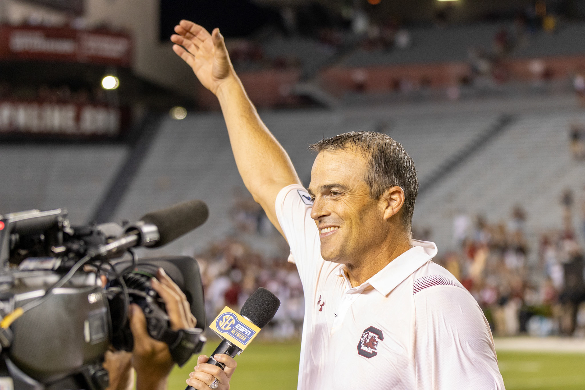 Head coach Shane Beamer walks onto the field of Williams-Brice Stadium before the game on Saturday, September 4, 2021.