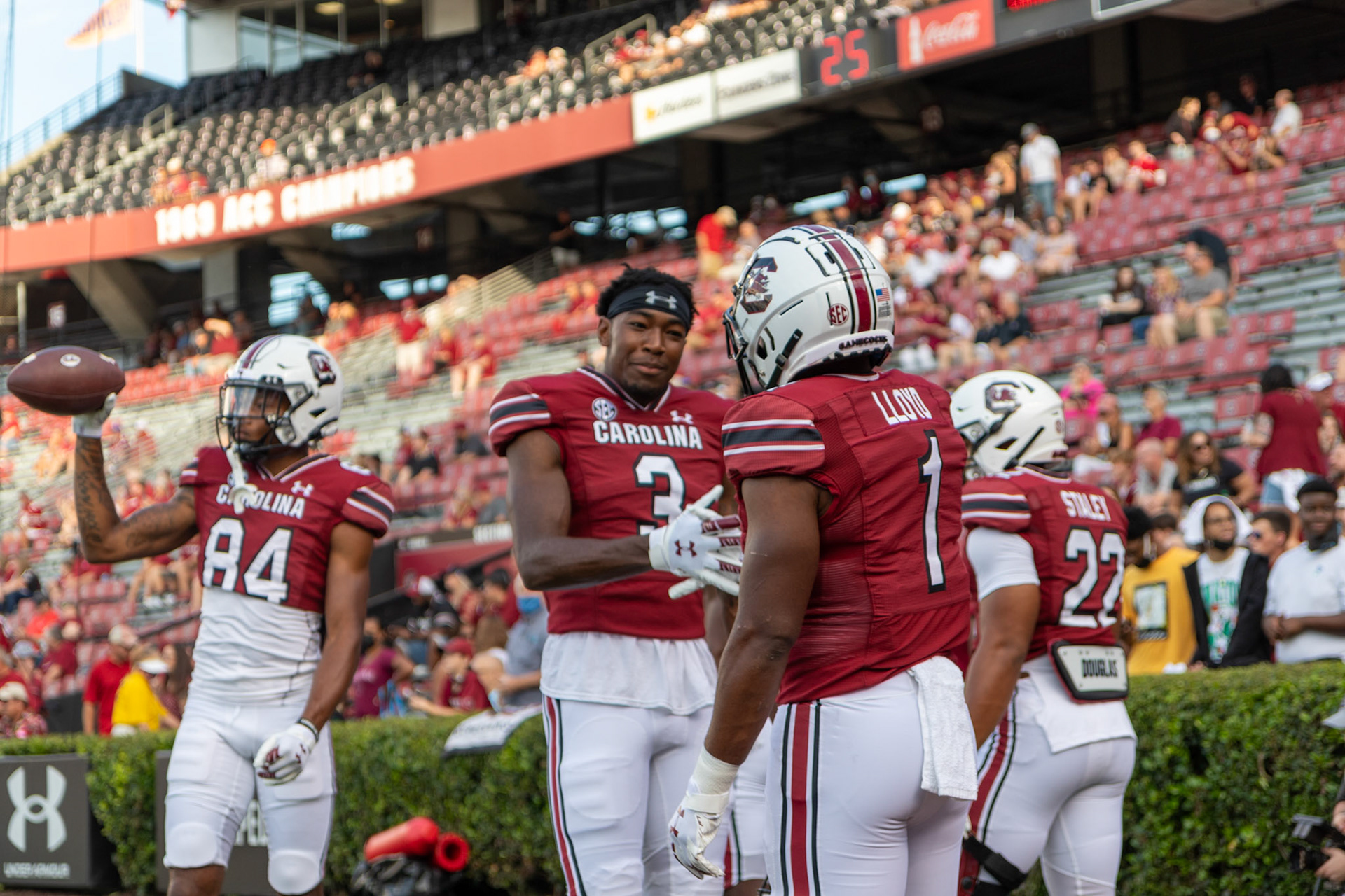 Sophomore tight end Jaheim Bell celebrates a touchdown pass from graduate student quarterback Zeb Noland. This touchdown brought the Gamecocks to 15 points at the end of the first quarter.