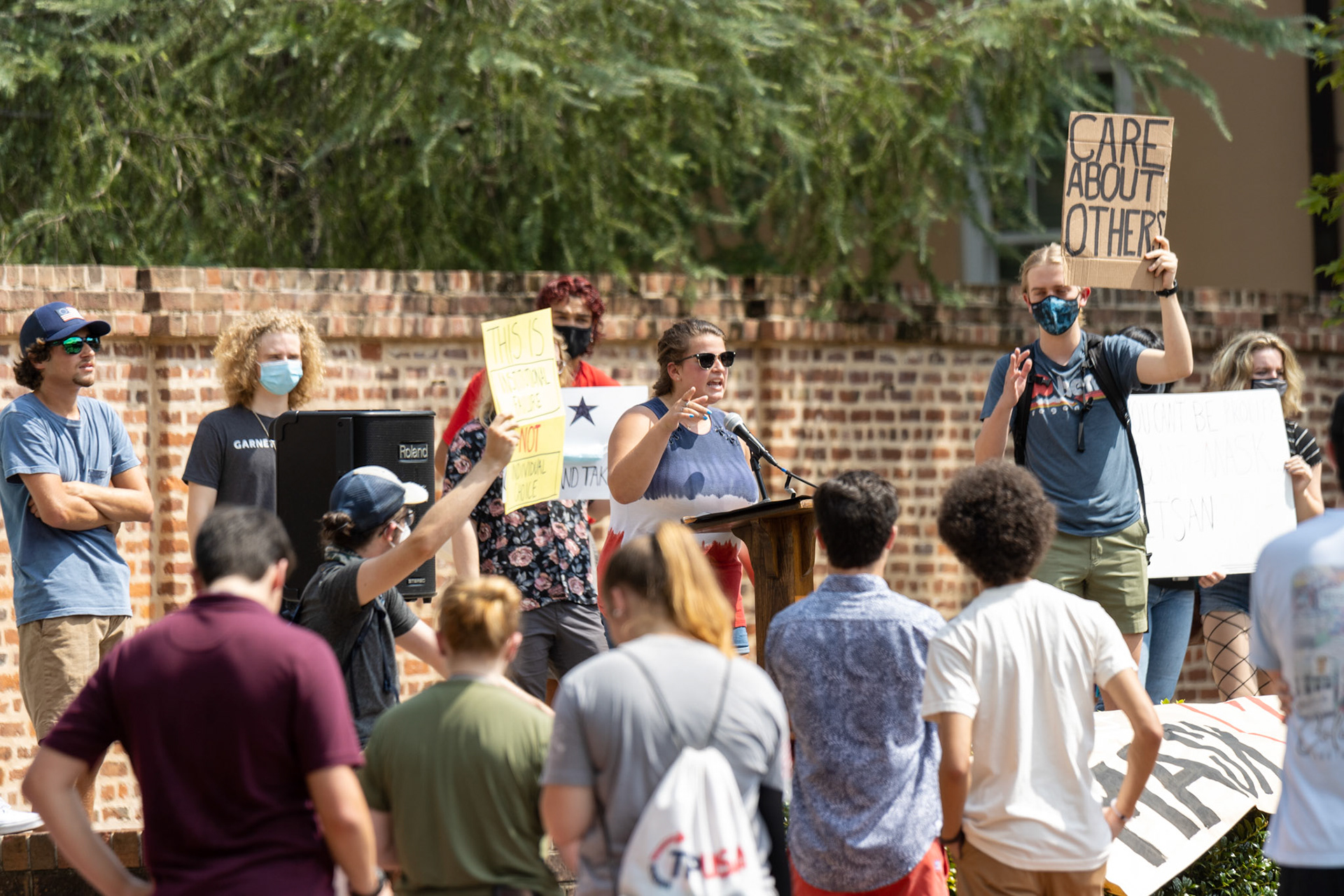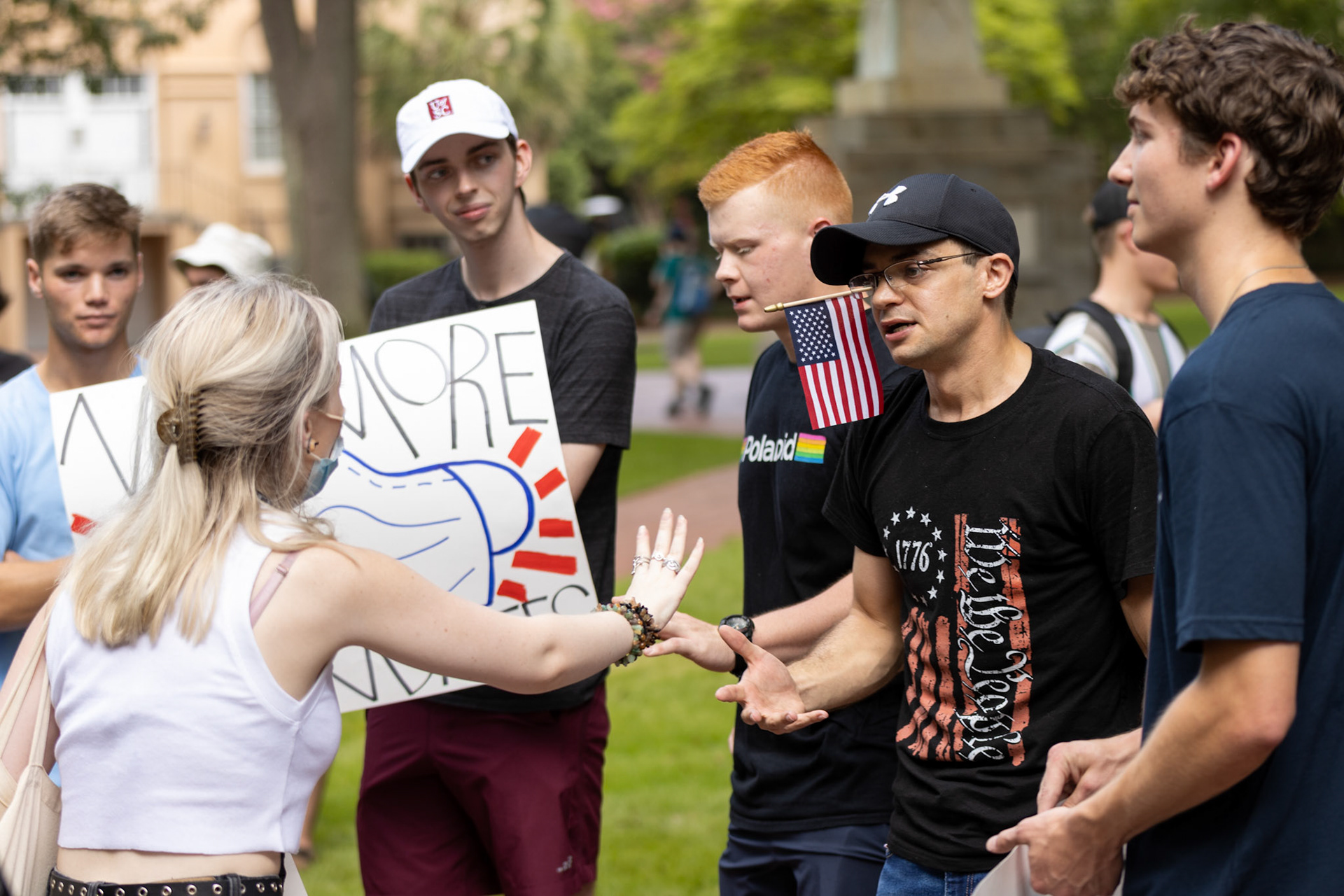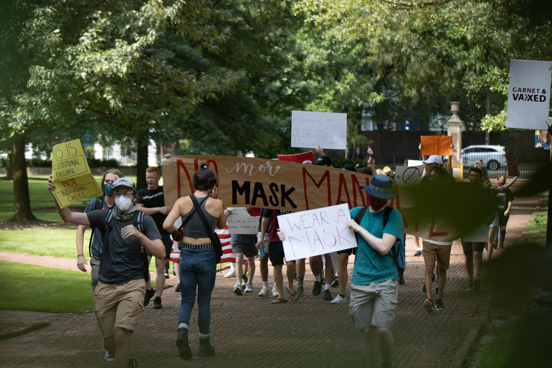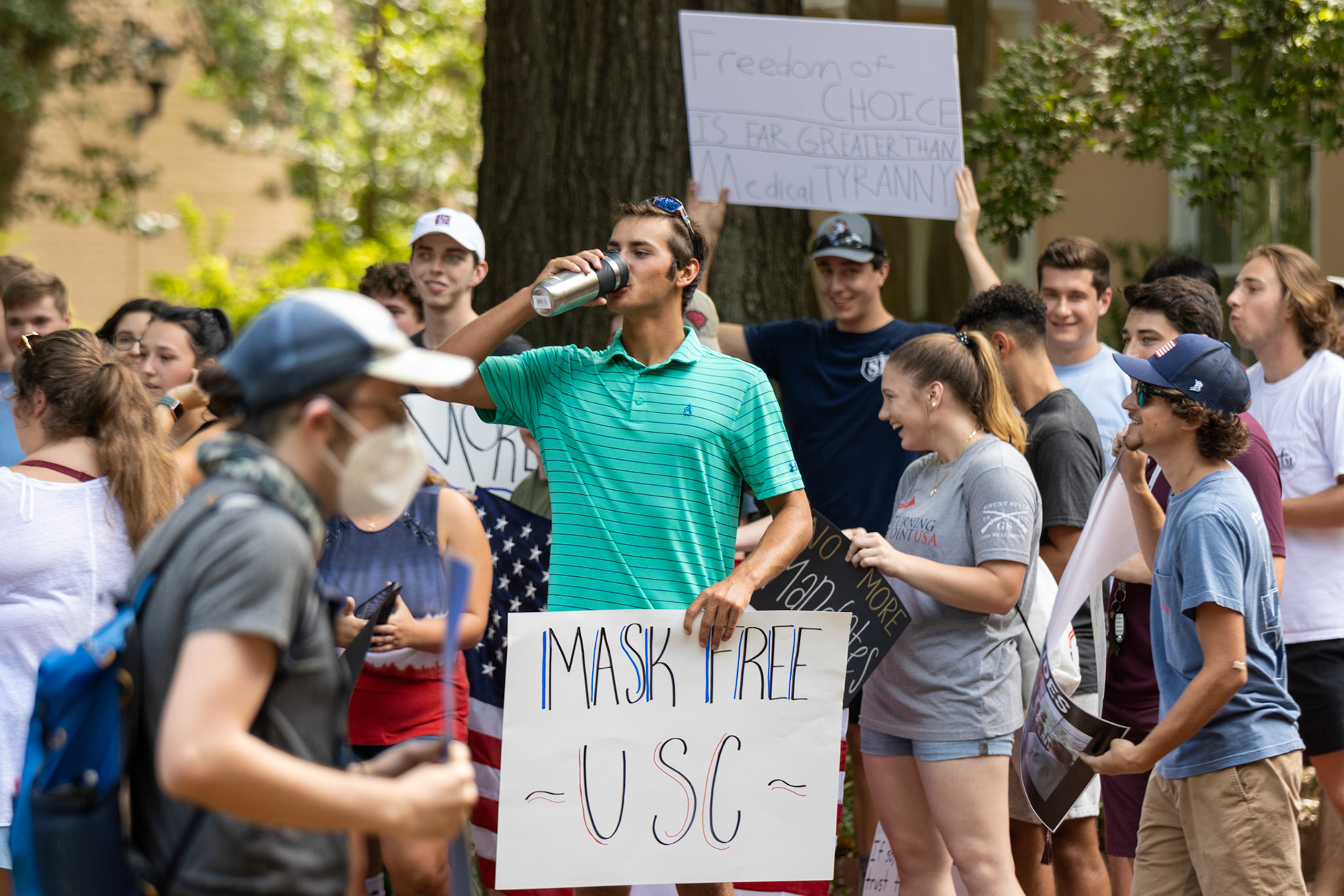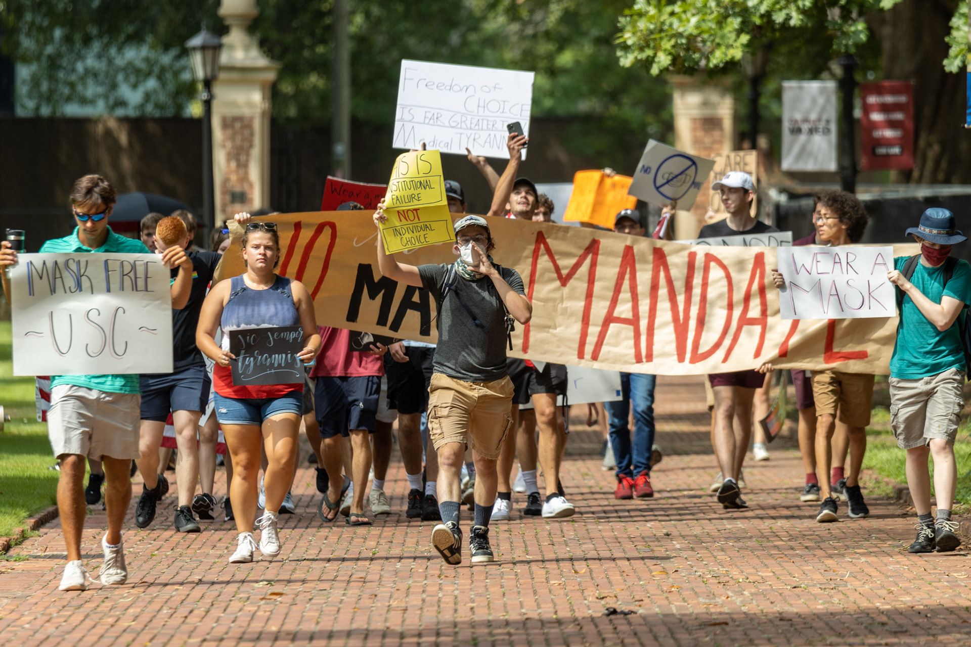 Two groups at the University of South Carolina came together on the horseshoe to protest their views of the recently reinstated mask mandate in campus facilities.